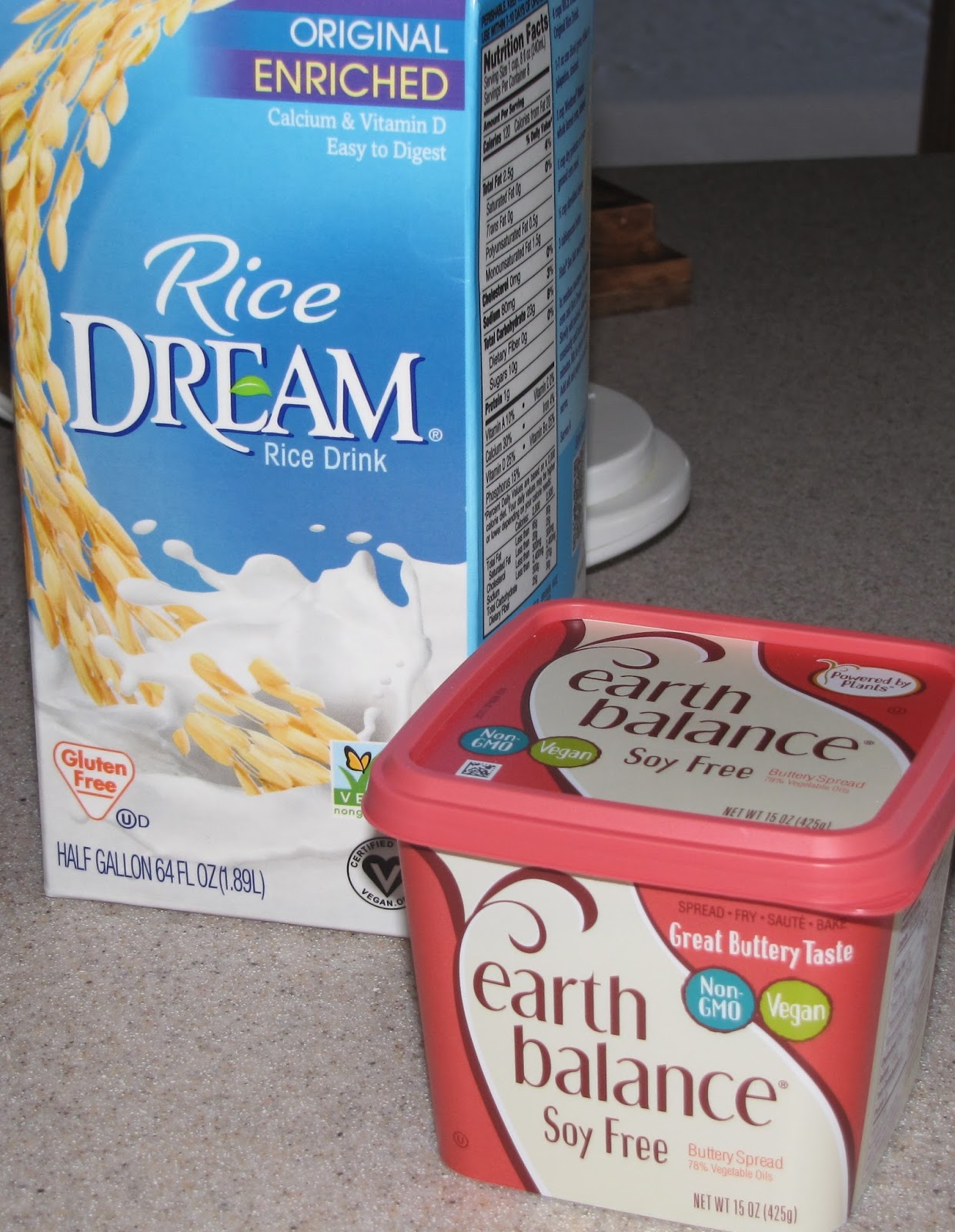 Vegan gravy: rice milk, vegan butter-like spread, flour, pureed garlic, onions, dill, salt and pepper.